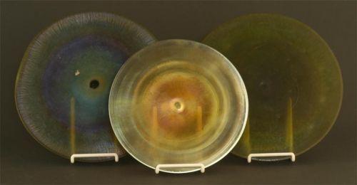 THREE GOLD IRIDESCENT ROUNDELS one with a Tiffany label, each approximately 12" diameter