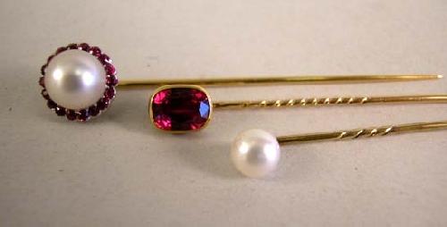 THREE GOLD STICK PINS comprising: one with collet-set oval faceted ruby, weighing apx. .30 ct., a 9mm pearl bordered by 18 round small rubies, and one with a pearl measuring 6.7mm