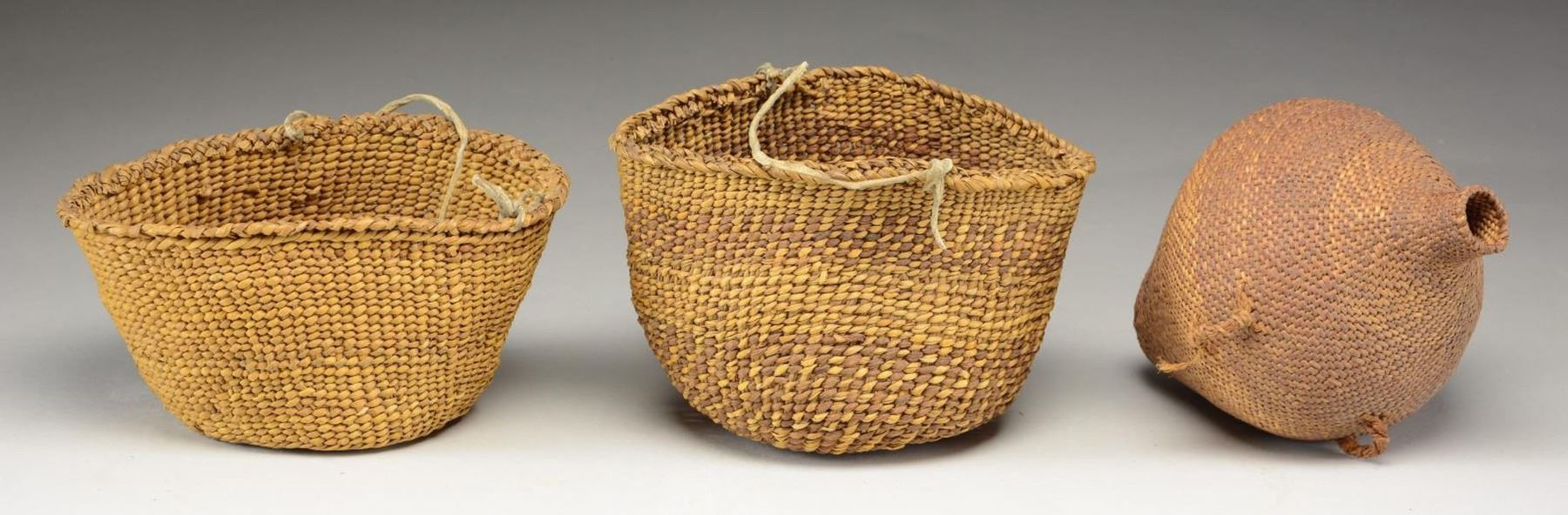 NATIVE AMERICAN BASKETS - 1 Seed basket; solid form like jug 8" high, 5.5" waist tapering to pointed base and open mouth, sound, complete with 2 attached handles. / One 7" diameter, 5" high, complete, rawhide attached handle, originally round, distorted shape now. / One 7" diameter, 4" high, complete, rawhide attached handle, originally round, oblong now. PROVENANCE: Martin Lane Historic & Western Americana Lifetime Collection. (02-21519/JS). $500-700.