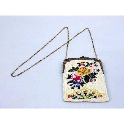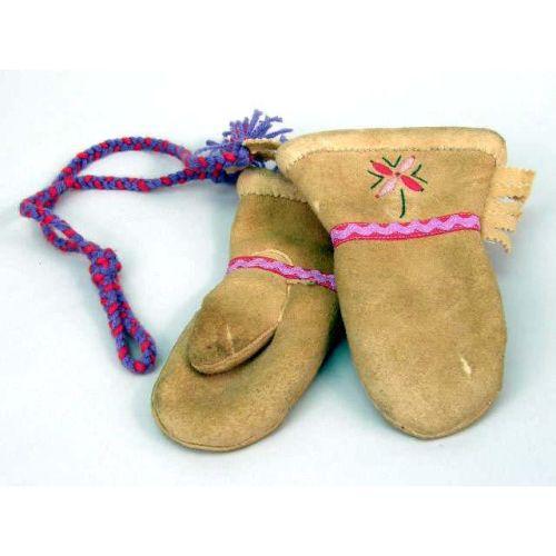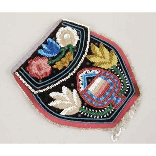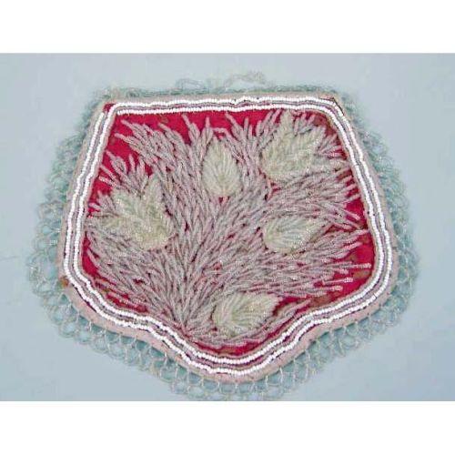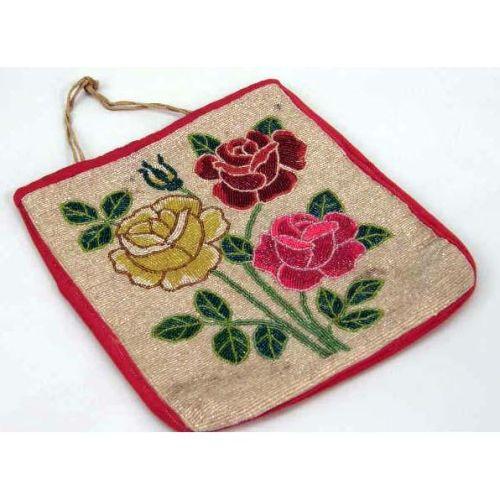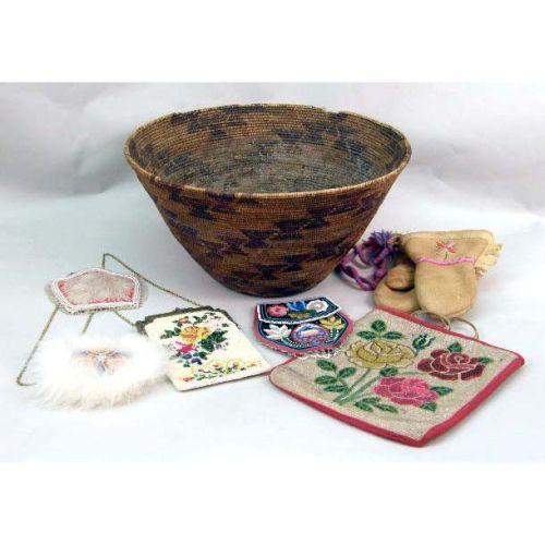 THREE INDIAN BEADED BAGS<BR><BR>Two with floral design. Together with a pair of Indian-embroidered child`s felt mittens, a large woven Indian basket, a beaded evening bag, probably Austrian. 7 pieces
