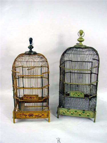 THREE IRON AND WOOD STENCIL-DECORATED BIRD CAGES; Tallest 25"h