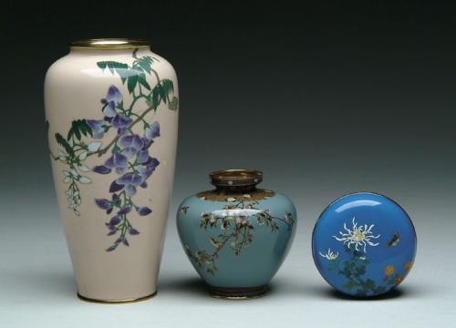 THREE JAPANESE CLOISONNE ENAMEL PIECES. Two vases and one covered round jar with floral decoration. 7-1/4 in. tapered vase has hanging purple and white flowers against a beige ground. Signed on base. 3-1/2 in. pear shaped vase with flowering branch and birds against a blue-green ground. 1-1/2 in. x 3 in. dia jar with flowers and butterfly against a medium blue background. CONDITION: Very good to excellent. Estate of Jon Heiden and Donald Mooers 5-60774, 5-60777, 5-60711
