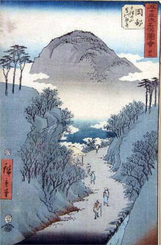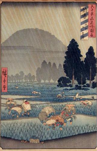Consisting of travelers on a mountain road approaching a tea house, peasants planting rice and a rooster. Sight size from 12"h by 7 1/2"w to 13 3/4"h x 9"w