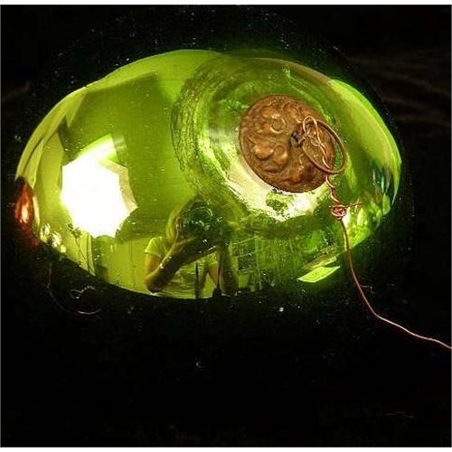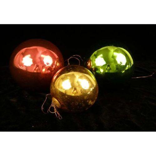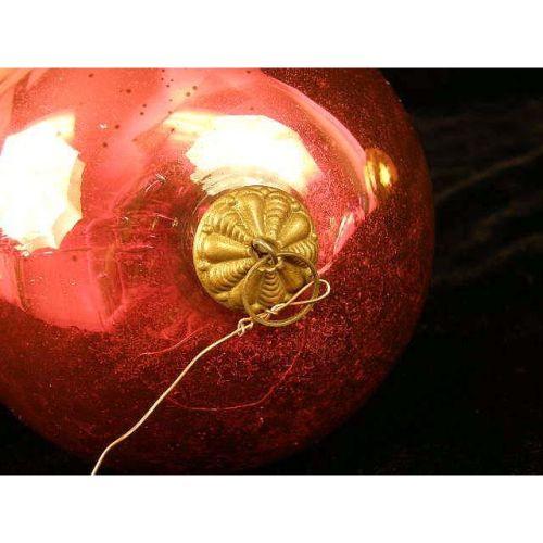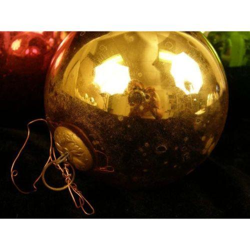 THREE KUGEL CHRISTMAS ORNAMENTS<BR><BR>Including, green, red, and gold, with embossed brass caps, some discoloration, from 3 3/4"dia to 4 3/4"dia.
