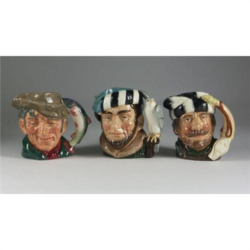 PORCELAIN: Three large size Royal Doulton porcelain figural jugs. The first is ''The Poacher'', D 6429, copr 1954, 7'' x 7'' x 4.25''. T he second is ''The Falconer'', D6533, copr 1959, 7.5'' x 7'' x 4''. The third is ''The Trapper'', D6609, copr 1966, 7.25'' x 7'' x 3.5''.