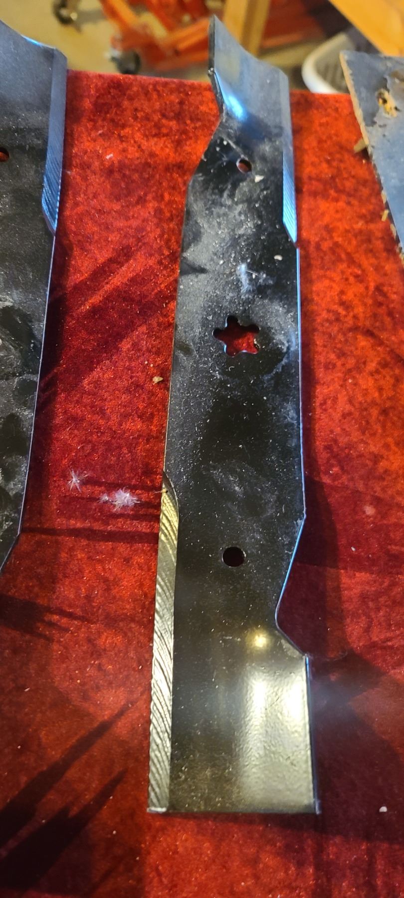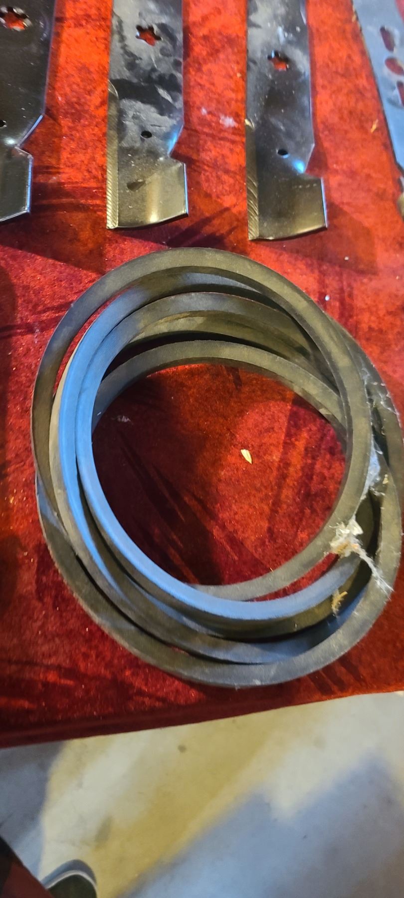 THREE LAWNMOWER BLADES AND DRIVE BELST
