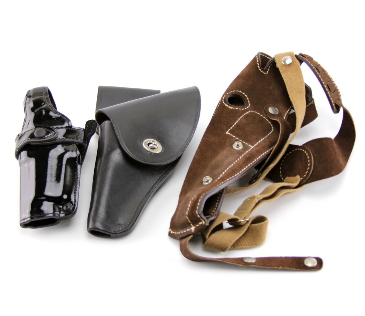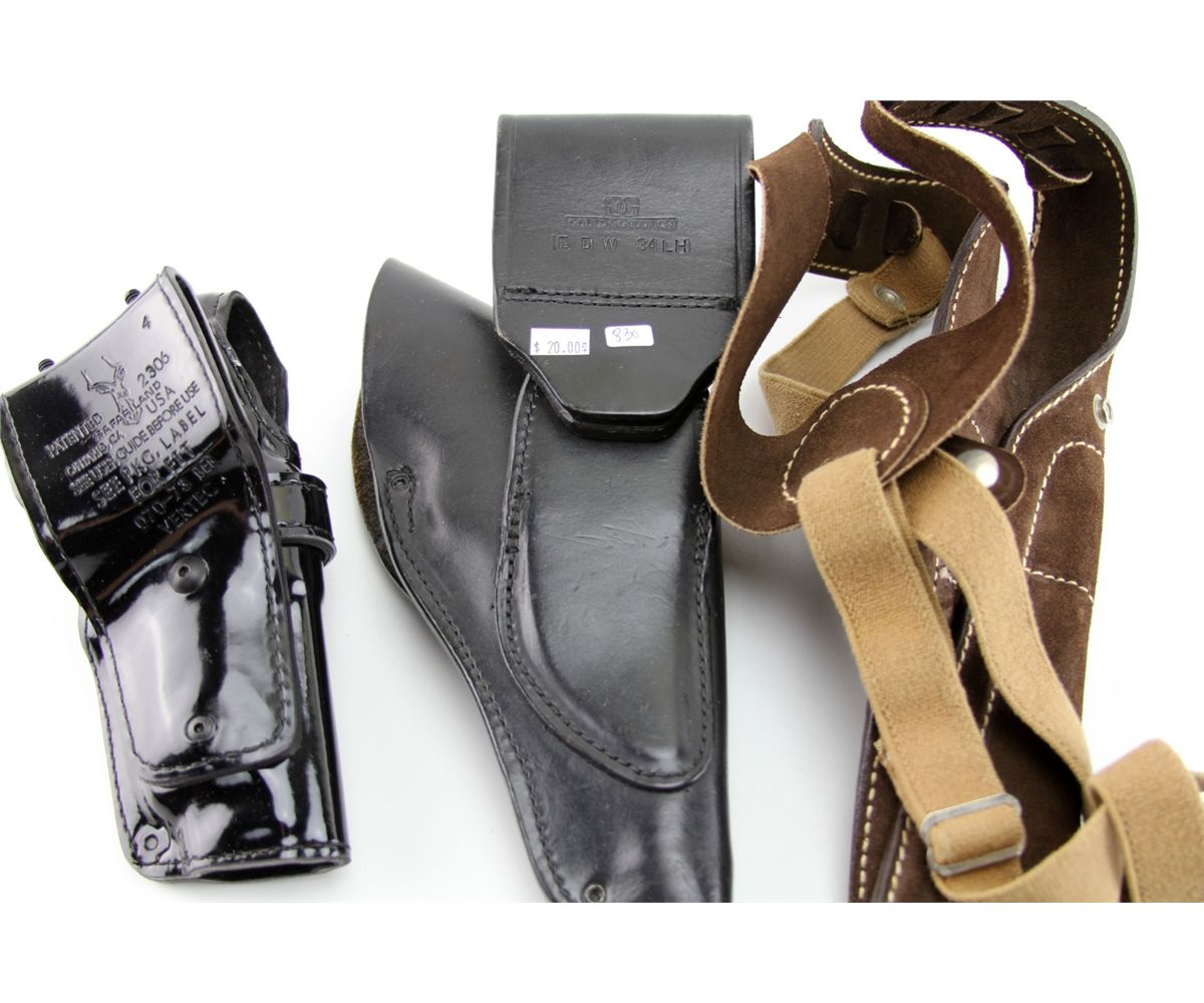 THREE LEATHER HOLSTERS TRIPLE K SAFARILAND & MORE Three leather holsters. One Triple K suede shoulder rig for large pistols & revolvers, and two LH duty holsters by Gould & Goodrich, and Safariland. All in very good condition.
