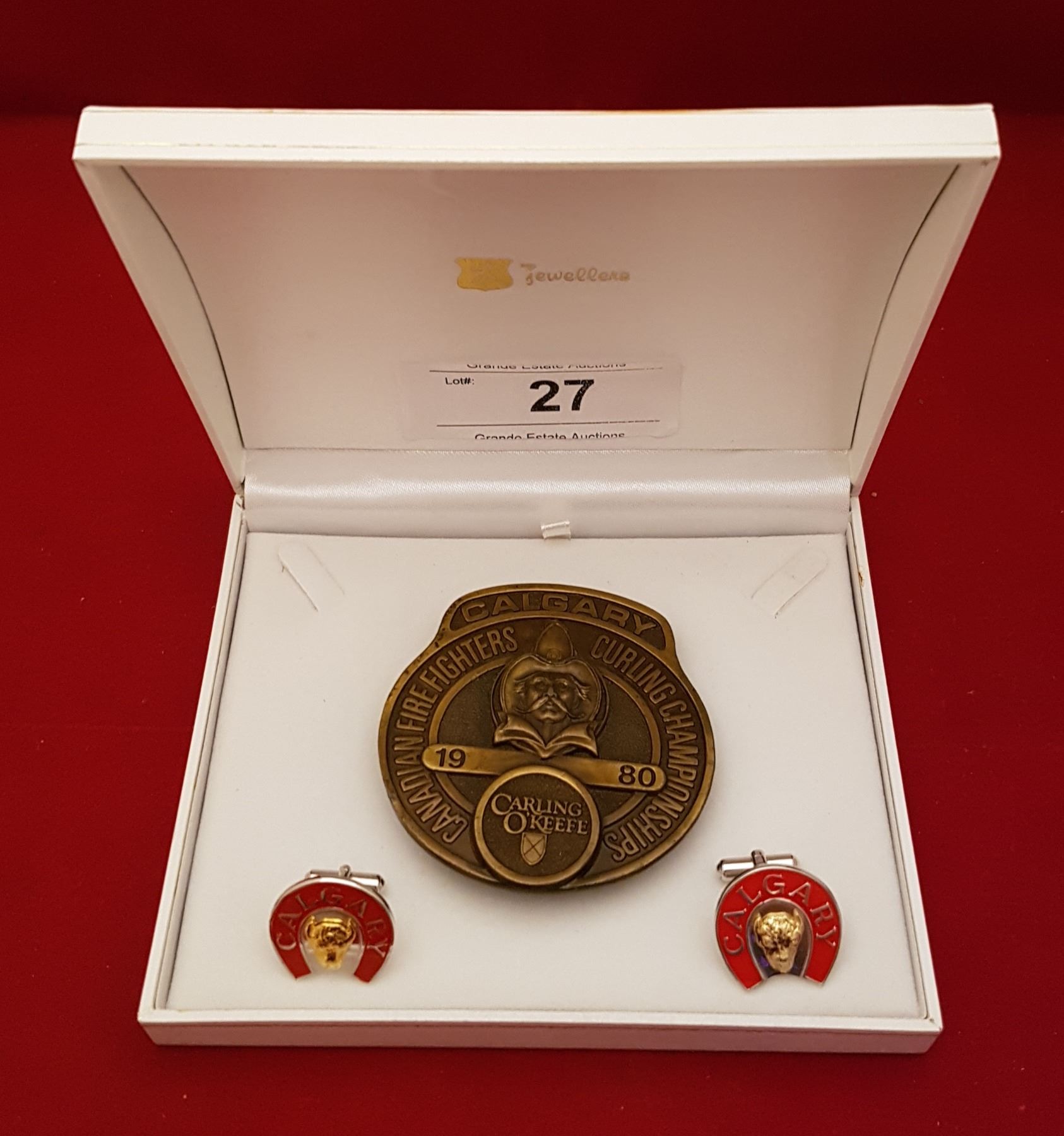 CALGARY 1980 FIREFIGHTERS CURLING CHAMPIONSHIP BUCKLE & PAIR OF CALGARY BUFFALO CUFFLINKS