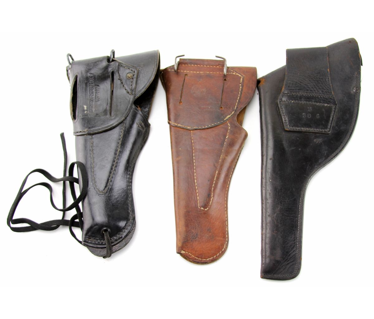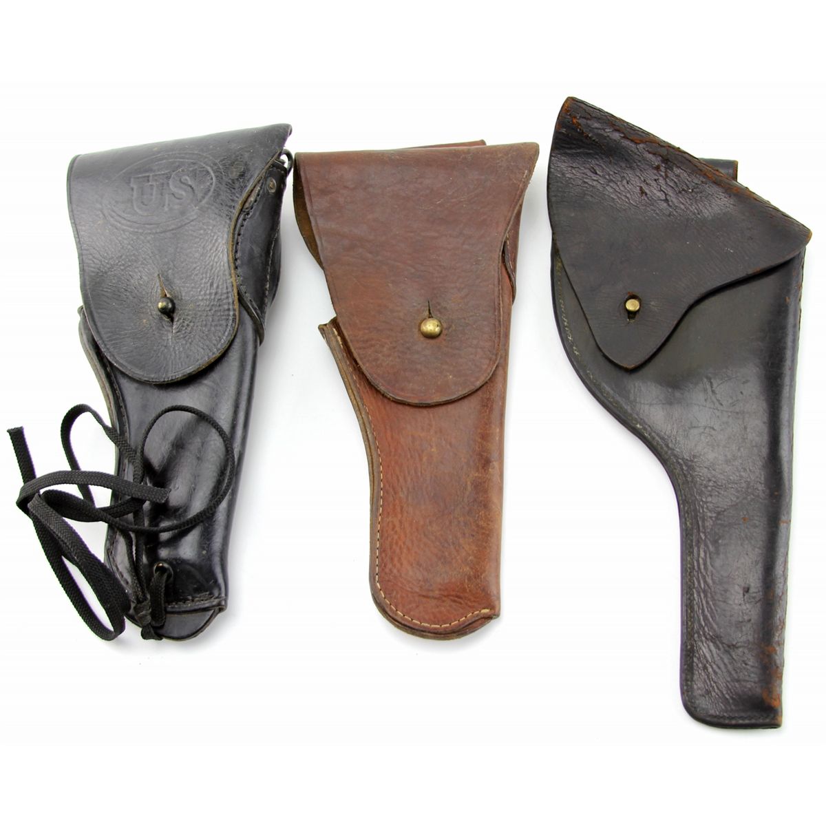 THREE MILIARY HOLSTERS CAVALRY & M1916 Three US Military holsters. One black cavalry holster appearing to be late 19th-early 20th Century, marked on back "B 38 6", and two US M1916 holsters, undated. Country: US Condition: