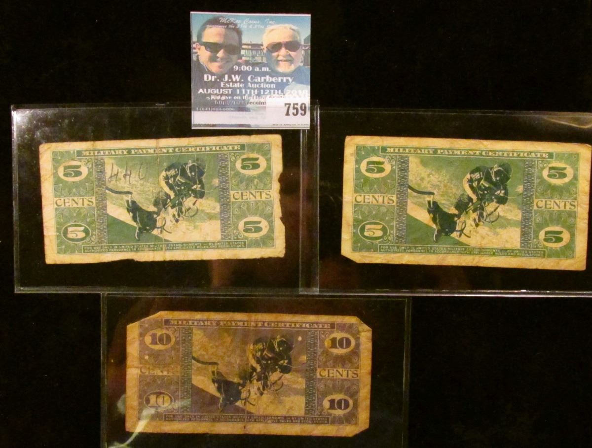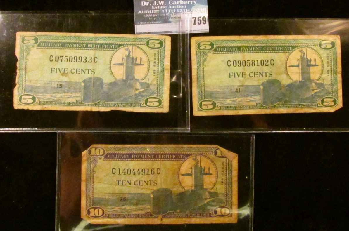 THREE MILITARY PAYMENT CERTIFICATES… THE FIRST IS A 10 CENT SERIES 681 NOTE. THE OTHER TWO ARE FIVE CENT NOTES