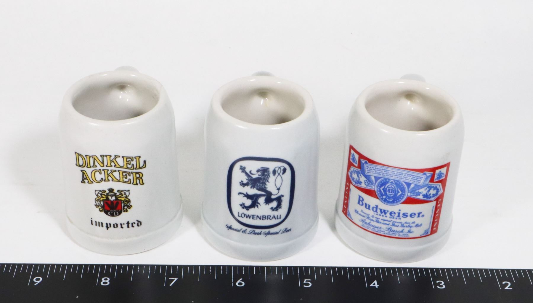 THREE MINI COLLECTABLE MUGS: BUDWEISER, DINKEL