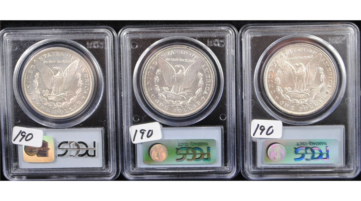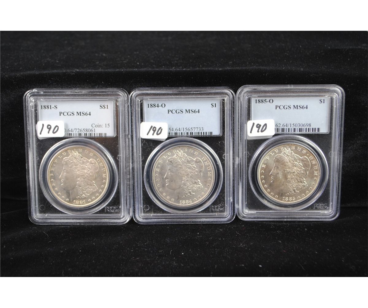 THREE MORGAN DOLLARS - PCGS MS64 - 1881-S, 1884-0, 1885-0 - SOLD PER COIN TIMES 3