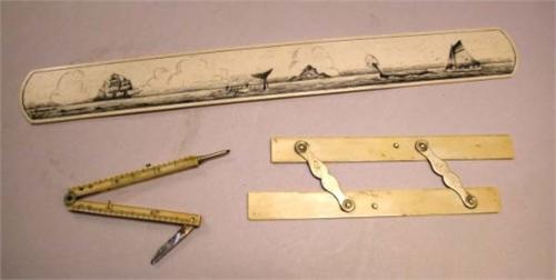 THREE NAUTICAL BONE-STYLE ITEMS INCLUDING: a folding ruler, a parallel ruler, and a ship and whale decorated "bask", 12 3/4"l