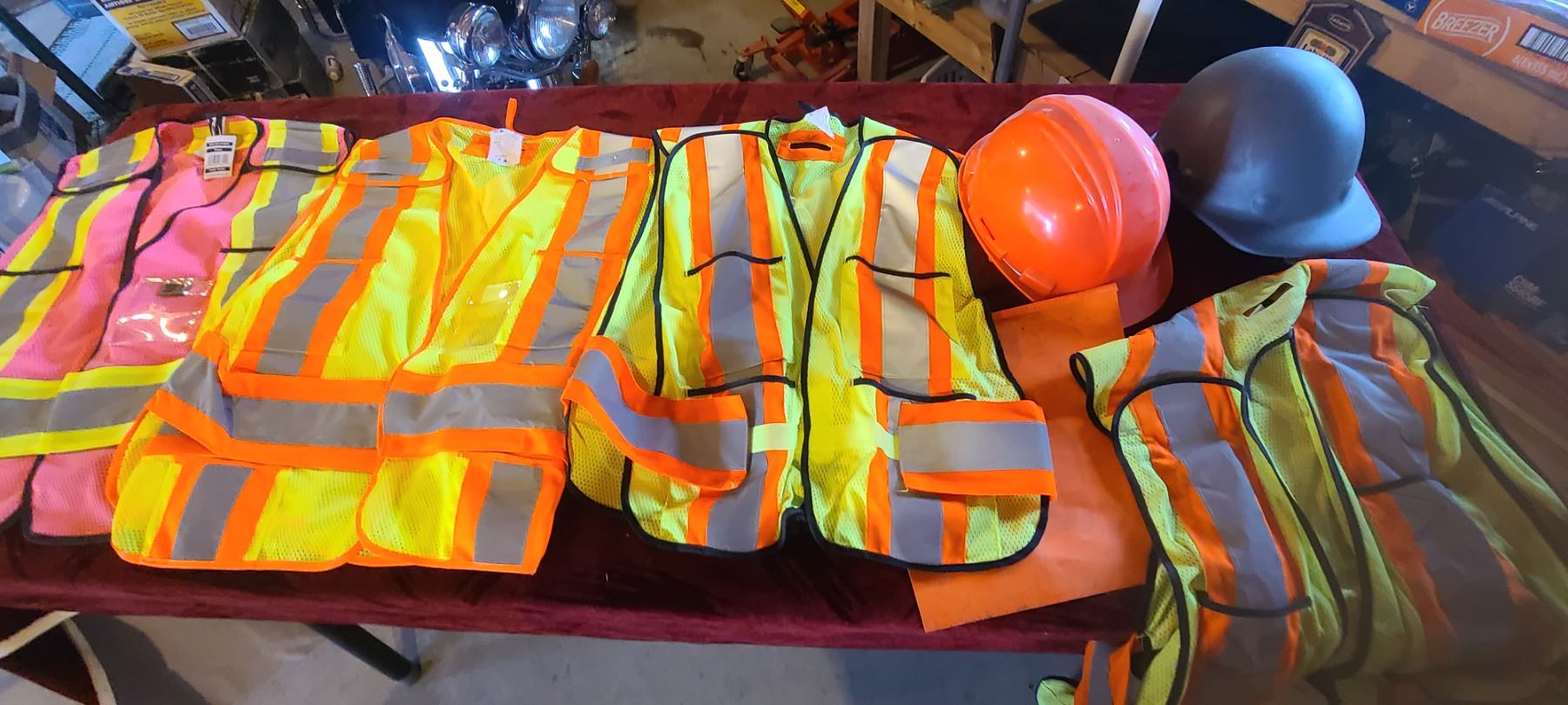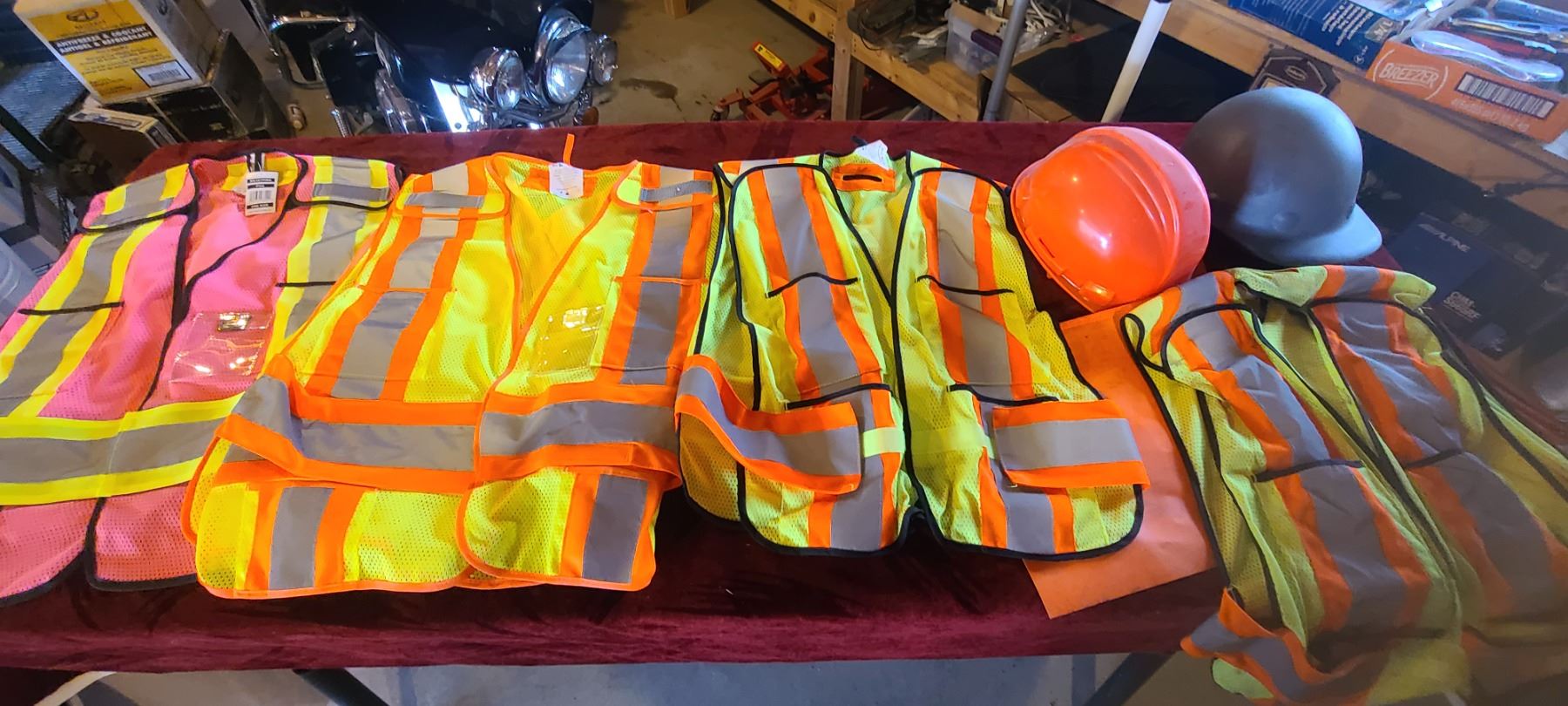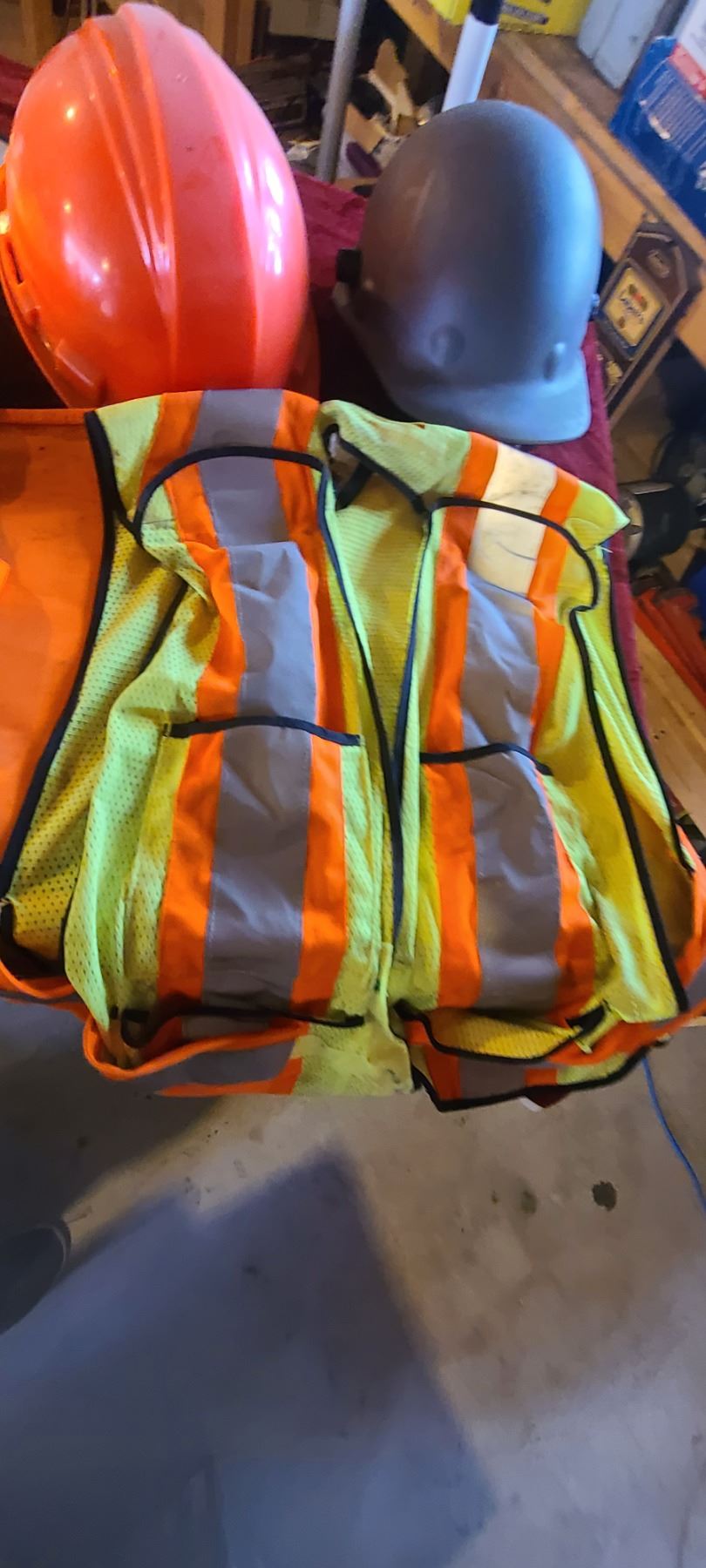 THREE NEW IVSEN HIGH VIS SAFETY VEASTS PLUS TWO HARD HATS AND A PAIR OF 48 TALL COVERALLS