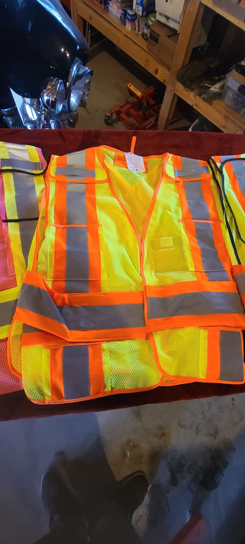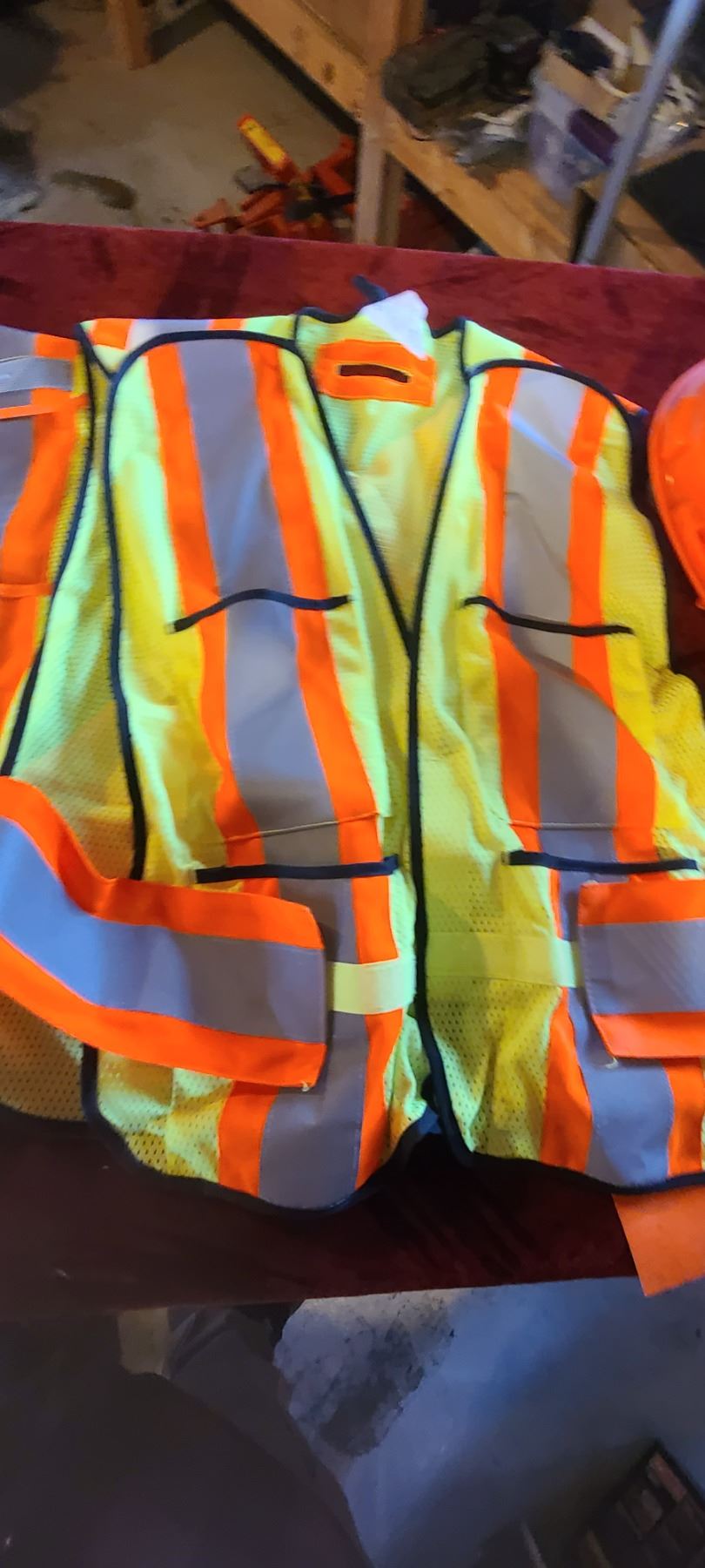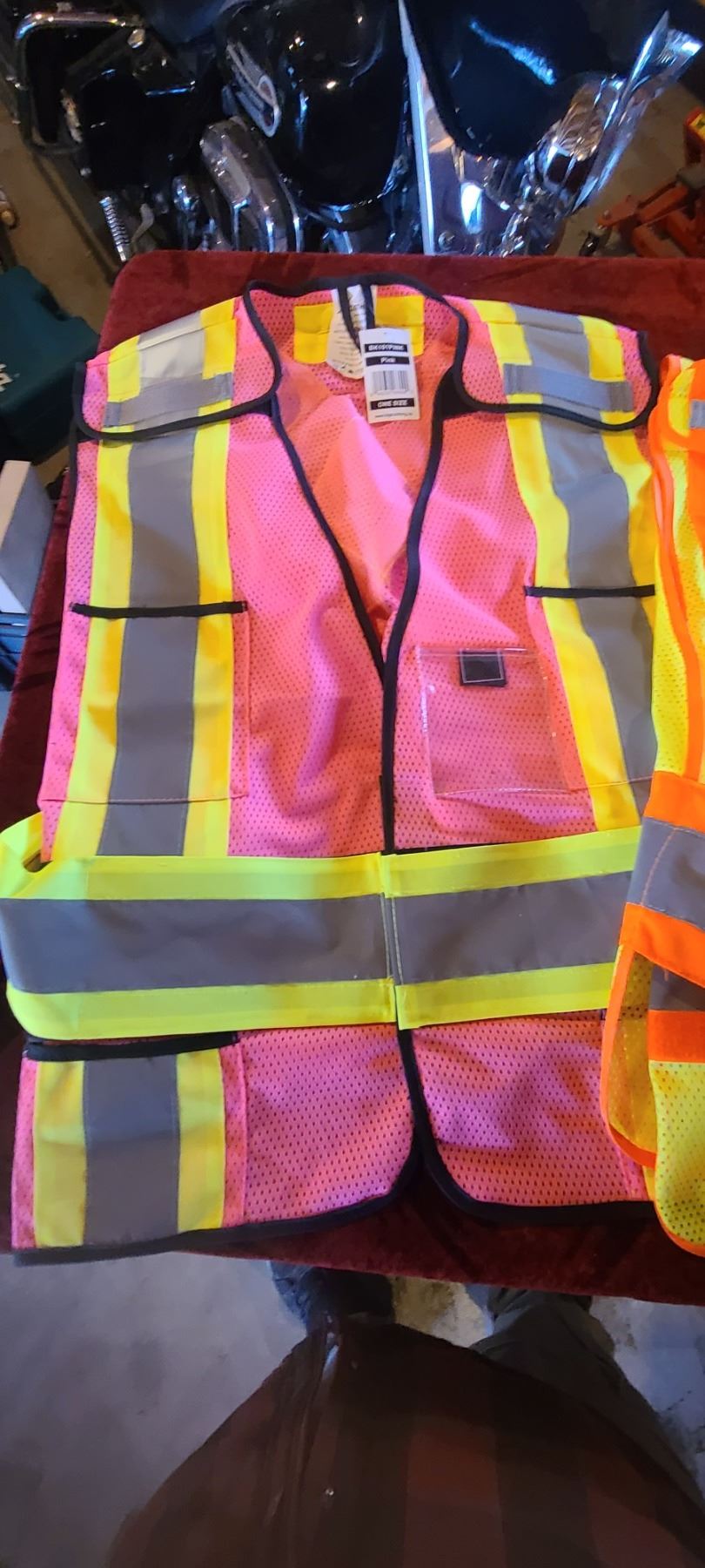 THREE NEW IVSEN HIGH VIS SAFETY VEASTS PLUS TWO HARD HATS AND A PAIR OF 48 TALL COVERALLS