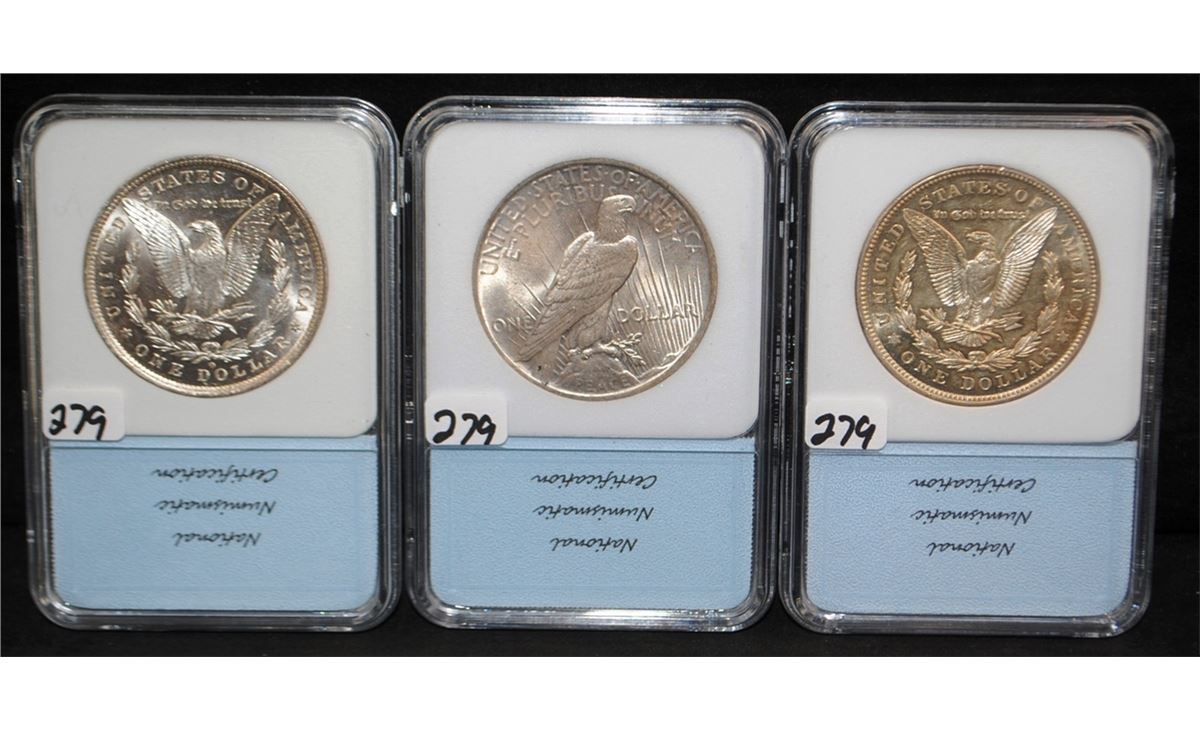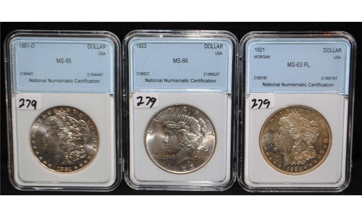 THREE NNC GRADED PEACE DOLLARS - 1881-0 NNC MS65, 1923 NNC MS66, 1921 NNC MS63PL - SOLD PER COIN TIMES 3