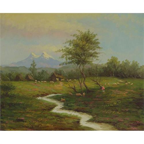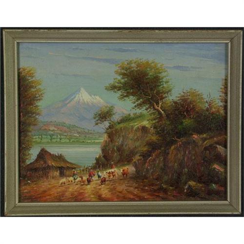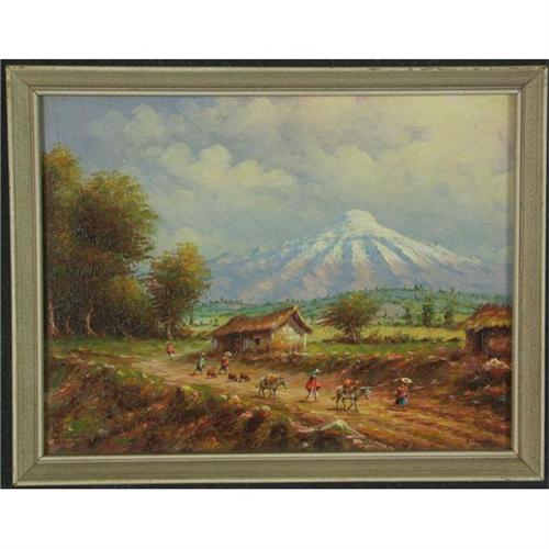 ONE OIL ON CANVAS (16.5'' x 20.5'') & TWO OILS ON PANEL (6.75'' x 8.75''), Hector Moncayo (20th century), Ecuador. Ecuadorian Mountain Village Scenes. All signed lower right. Two smaller pieces with inscription ''El Lotacachi, Ecuador'' and ''El Fayambe, Ecuador'' lower left. Placed in cream wood frames. More info. in the white binder.