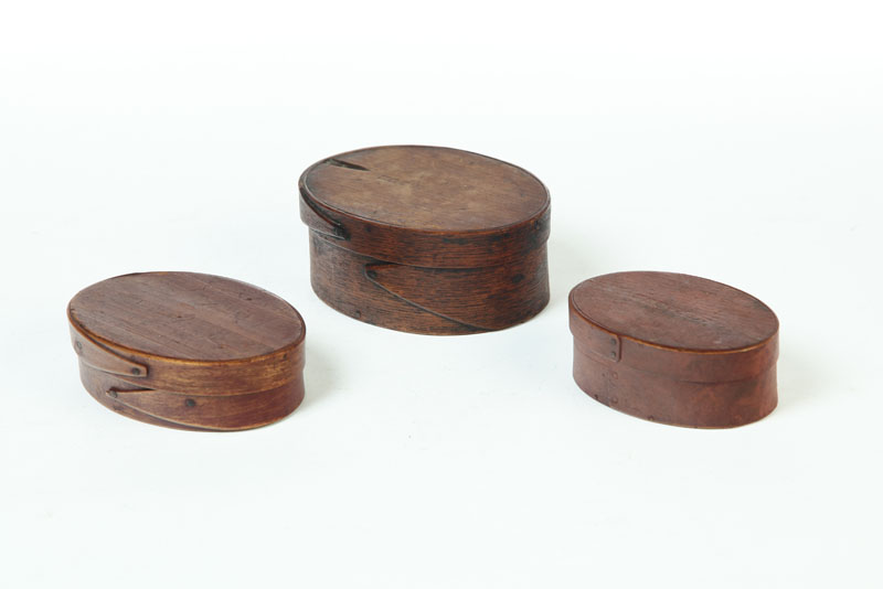 American, 2nd half-19th century, bentwood. Copper tacks, traces of original red, 1 1/2"h. 5 1/4"w., and two with iron tacks and impressed labels "Sprague". Original red, 1 1/4"h. 4 1/2"w. and 2"h. 5 1/2"w.