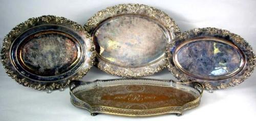 THREE OVAL SILVER PLATED TRAYS; Together with a footed square tray and an oval galleried footed tray, Longest 19"l, (wear)