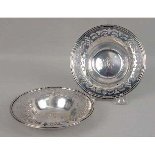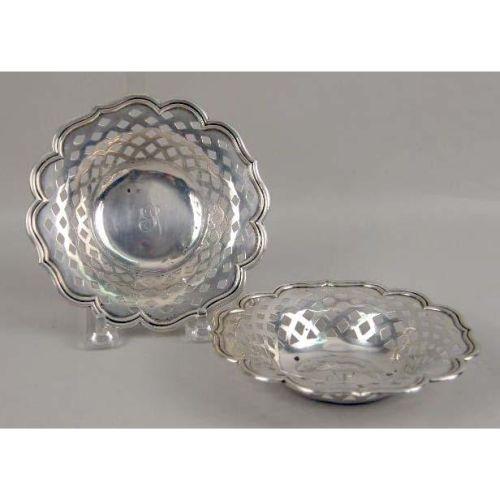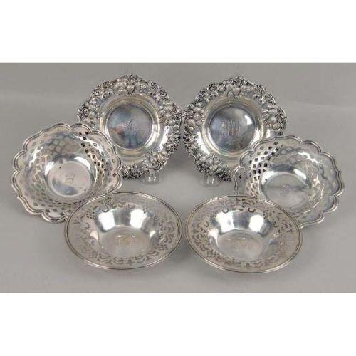 THREE PAIR OF AMERICAN STERLING SILVER BONBON DISHES<BR><BR>All with centered monogram, comprising a pair with repousse strawberry motif border, a Towle pair with scalloped rim and reticulated basketweave motif, and a Towle pair with pierced border, each apx. 5-1/2"diameter, total weight apx. 14 T.O.