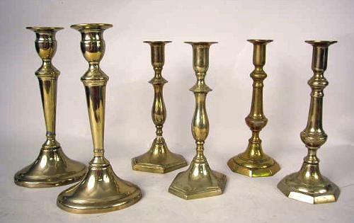 THREE PAIR OF CAST-BRASS CANDLESTICKS; Continental, 6 pieces, tallest 10 1/2" h