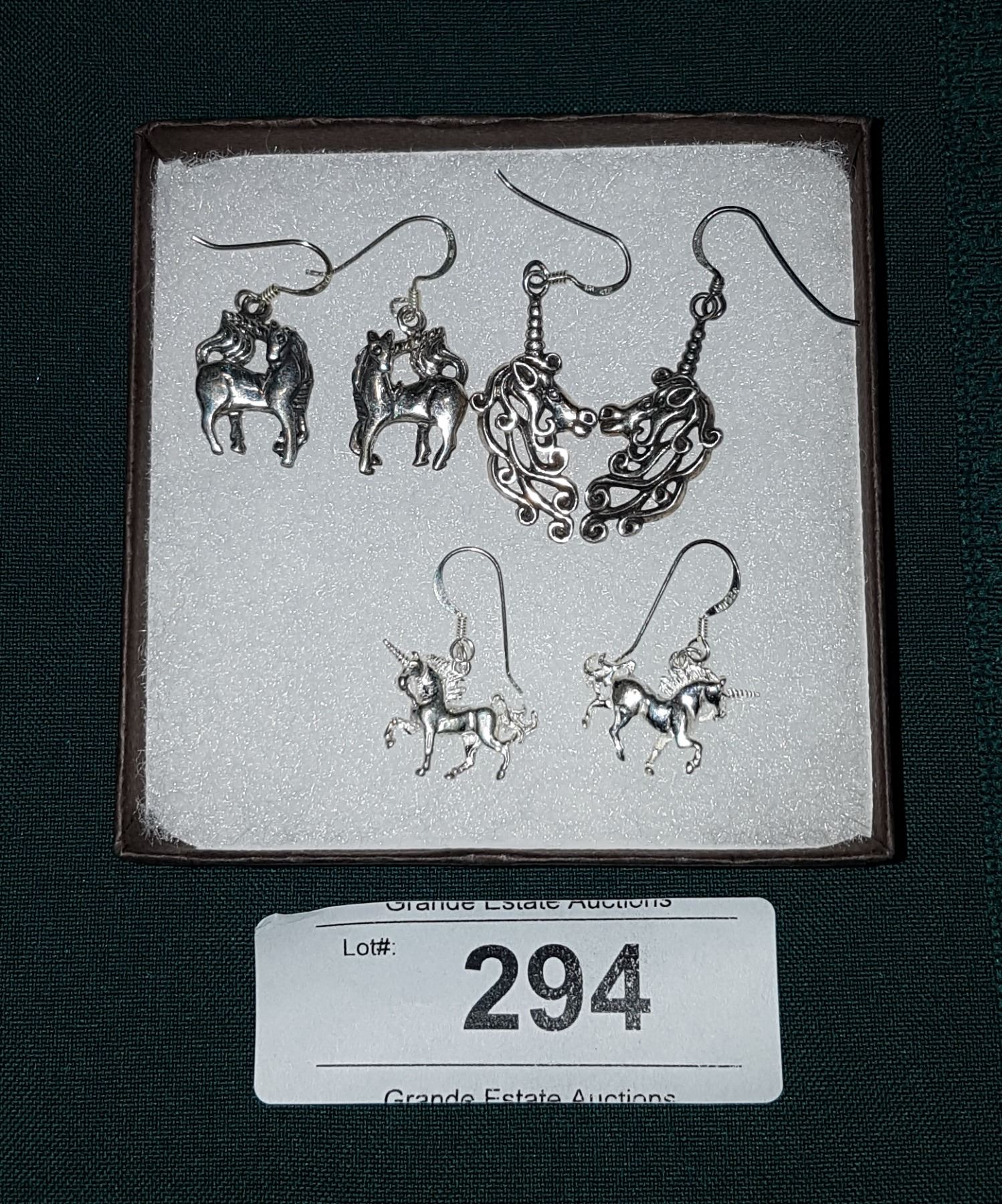 THREE PAIRS STERLING SILVER UNICORN EARRINGS