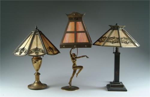 THREE PANEL LAMPS. 1) Four sided Arts and Crafts shade with windowpane design and orange, yellow and pink slag panels. Shade is married to Art Deco G. Thew base. Base depicts Art Nouveau nude woman with one leg raised and arms outstretched. Marked on the underside "© G Thew 1929". SIZE: Shade is 9-1/4 in. sq. Overall height is 24 in. CONDITION: Shade has small bracket and hole on alternating sides from previous mounting on original base. Base has minor wear to finish. 2) Eight panel Bradley and Hubbard shade with filigree design across middle of each panel. Shade is married to a step-form square base. Shade is signed "Bradley and Hubbard Mfg. Co.". SIZE: Shade is 13 in. dia. Overall height is 20-1/2 in. CONDITION: Shade has three solder repairs to joints at bottom corner. Base has new sockets, homemade adapter ring for shade and finish is worn. 3) Bradley and Hubbard eight panel shade with stylized three leaf design over each panel. Shade is signed on the inside "Bradley and Hubbard Mfg. Co." and is married to a brass two socket adjustable height base. SIZE: Shade is 14-1/2 in. dia. Overall height is 19-1/2 in. CONDITION: Shade is very good to excellent. Base shows some wear. Estate of Edwin Schiebel Sr. 5-60005, 5-60035, 5-60036