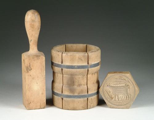 THREE PART METAL BOUND ROLL TYPE BUTTER MOLD. The hexagonal interior print has standing cow in circle in nice detail. It has turned handle square plunger and double steel banded six slat carved barrel form housing. SIZE: 2-3/4in. print dia. 4-1/2in. h housing. CONDITION: Generally good. 9-25384