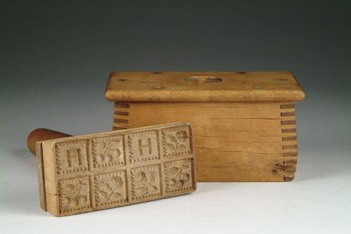 THREE PART RECTANGULAR CARVED WOOD BUTTER MOLD. Kinerson type combination mold. The rectangular print divided into eight cake prints. Three are flowers, three are cherry and two are ""H"". The rectangular board has another thinner board screwed to the bottom. containing a round hole in the center for a turned removable handle. The machine dovetailed box has top board affixed with six small screws. SIZE: 7in. h with handle x 6in. w x 3-1/2in. d. CONDITION: Some cracking but generally good. 9-25385