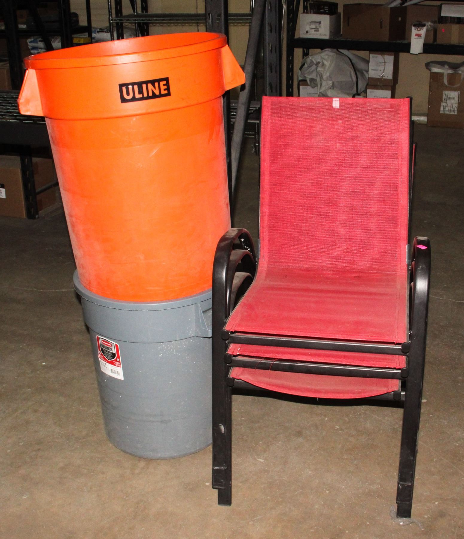 THREE PATIO CHAIRS AND GARBAGE CANS (NO LIDS)