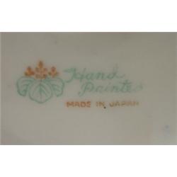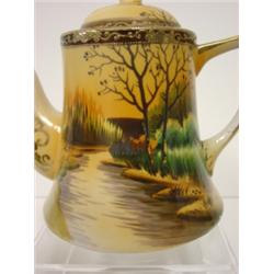 Three piece Nippon style hand painted tea set consisting of teapot & sugar & creamer. Decorated with marsh scene and gold jeweled decoration. Marked on bottom "Hand Painted, Made in Japan. Teapot: 6" H.