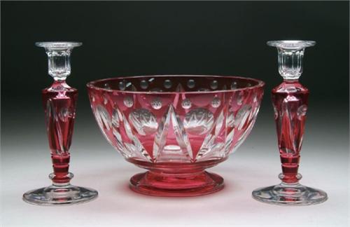 THREE PIECE CONSOLE SET. Three piece console set has cranberry cut to clear large pedestal bowl with two matching candlesticks. Candlesticks are signed in script "Val St. Lambert". SIZE: Bowl is 12 in. dia x 7 in. t. Candlesticks are 10 in. t. CONDITION: Very good to excellent. Estate of Edwin Schiebel Sr. 5-60105