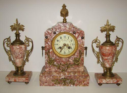 THREE PIECE FRENCH MARBLE GARNITURE SET. Consists of clock and two urns. Clock has red and white marble body decorated with ormalu bronze floral decoration at front, handles at sides, and floral finial at top. Clock face is marked “G. Godfroy/?-A-Bataille". Urns are composed of red and white marble with ormalu bronze handles and floral decorated tops. Clock: 14.25” H. Urns: 11.5” H