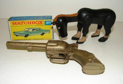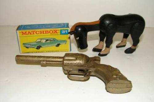 THREE PIECE LOT OF VINTAGE TOYS. Comprising a Matchbox #31 Lincoln Continental mint in box, a small cap pistol, and a poseable black horse in as-is condition.