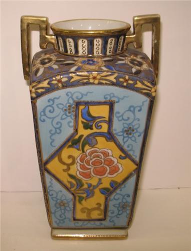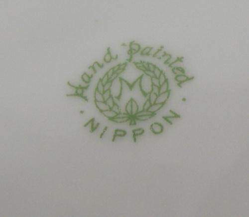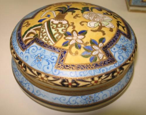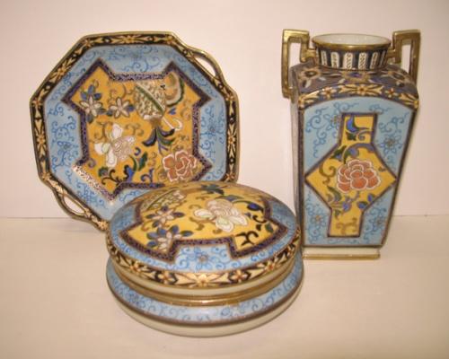 THREE PIECE NIPPON SET. Consists of one powder jar with lid (4” H, 6.5” Dia.), one mantel urn (9” H), and one tray (9” Dia.). All are decorated with hand painted floral and cobalt and jeweled gilt decoration. Vase shows loss to gilt at handles. All are marked on bottom with green Nippon wreath mark.