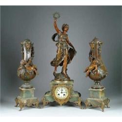 Lot # 1289 THREE PIECE ONYX AND BRONZED METAL CLOCK SET. After L. F. Moreau. Small plaque on clock figure “Au Merite par L & F Moreau Mlle d’Or”. Central clock on stepped and molded edge green onyx base mounted with a circular clock face having floral decorated enamel dial. Four bronze type scroll feet, top surmounted by a 15-1/2” figure of a woman holding a wreath crown in one hand and a tablet marked “Au Merite” in the other. Two side garnitures are identical and have similar bases surmounted by a cherub and swag decorated covered urn. SIZE: Garnitures are 19-1/2” h. Clock is 26” h. CONDITION: Very good. Key and pendulum present. 9-98106 (1,500-2,500)