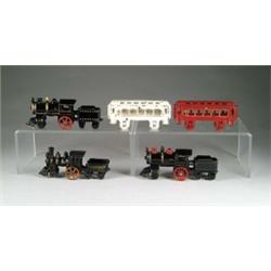 THREE PIECE TRAIN SET W/ TWO ADDITIONAL ENGINES. 1) This Kenton set consists of a combined engine & tender and two passenger cars. Engine in black enamel, passenger cars in white and red respectively. SIZE: 19" l (overall). CONDITION: Extremely fine. Minor chipping overall. 2) A combined engine and tender by Kenton. SIZE: 7" l. CONDITION: Very fine. 3) Combined engine and tender by Hubley. SIZE: 6-1/2" l. CONDITION: Very good+. JL 1-3896 (250-350)