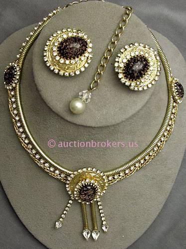 THREE PIECE VINTAGE HOBE JEWELRY SET INCLUDING A NECKLACE AND CLIP STYLE EARRINGS FEATURING RHINESTO
