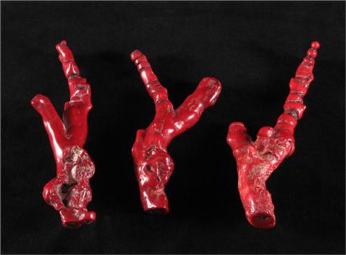 Lot coral to include three branches of color-enhanced bamboo coral, one with a crack through the base. 7'', 8'' and 8.25'' heights.