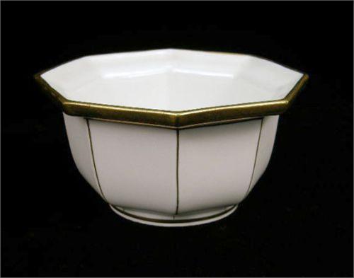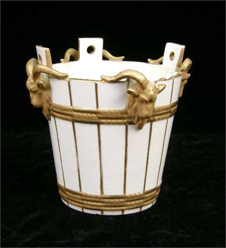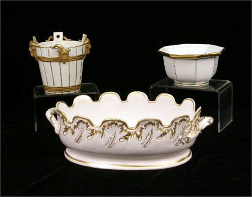 Consisting of a wineglass washer, a small Meissen octagonal bowl and a ramshead-decorated bucket with a Sevres-type mark. The glass washer 4 1/4"h x 13"l x 7 5/8"w, the Meissen 3"h x 5 1/2"dia., the "Sevres" 5"h x 5 1/8"dia. One ram`s head with a broken horn.