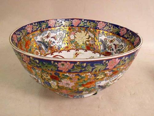 Chinese, comprising a punch bowl, 12"dia., a tea caddy, and a tobacco jar. Chips.