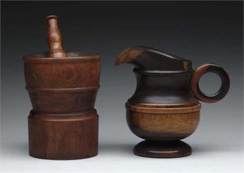 THREE PIECES OF LIGNUM VITAE. 1) 8-1/4” h footed pitcher with ring handle and large pouring rim. 1) Large 10-1/2” turned mortar and pestle. CONDITION: Very good. 9-26854