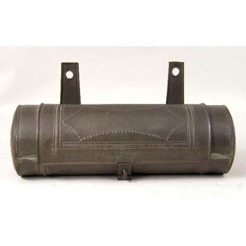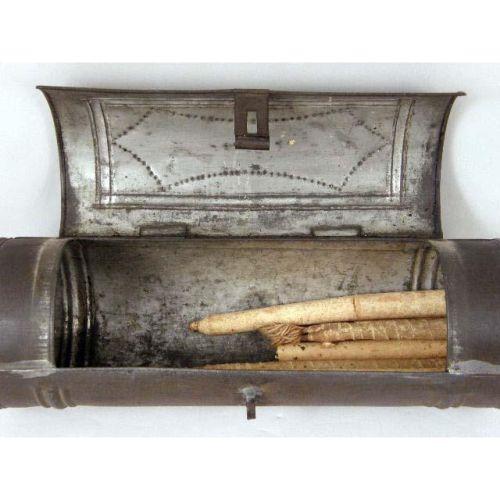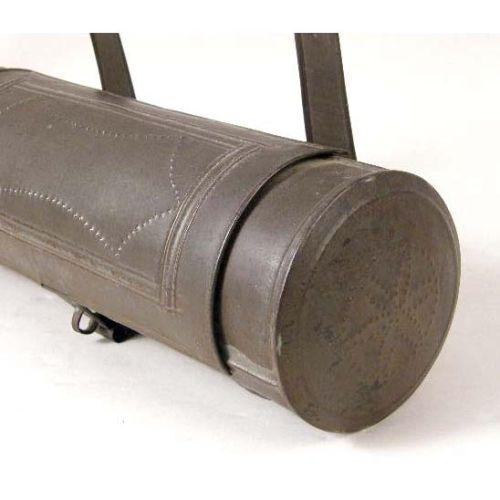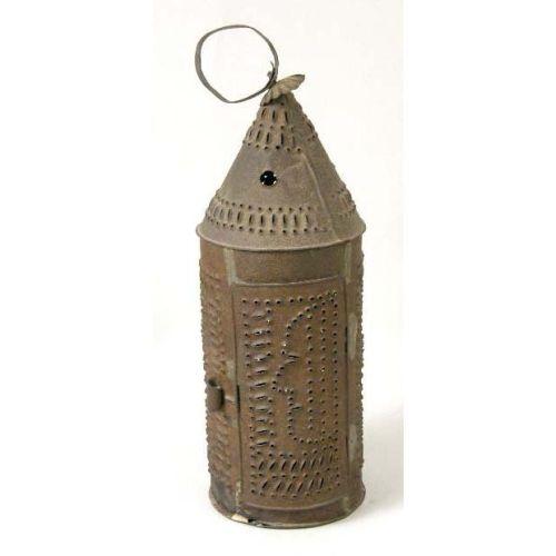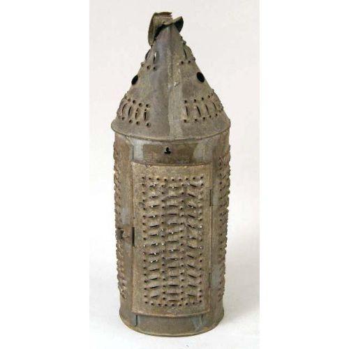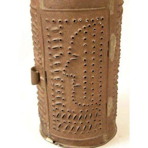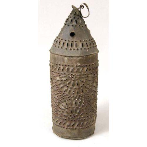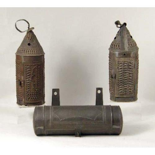 THREE PIECES OF TINWARE<BR><BR>consisting of a punched hanging candlebox and two rolled-and-pierced tin lanterns. Candle box 8" high x 14 1/2" long x 5" deep.