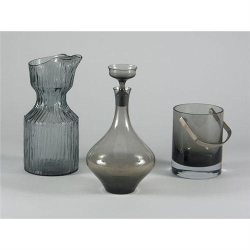 ART GLASS: Three pieces Scandinavian style art glass pieces to include a thin crystal decanter with stopper, marked '55 on underside, 9'' x 5'', a pinched spout water pitcher attributed to Tapio Wirkkala's Iittala Ultima Thule line (1960's), 10'' x 4.5'', and a small heavy crystal ice bucket, unattributed, with a steel handle, 5.5'' x 4''