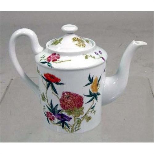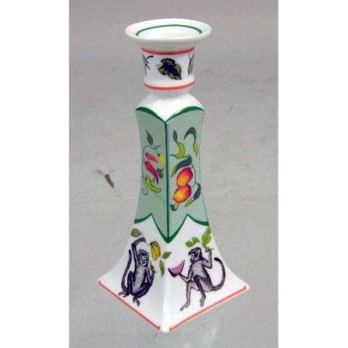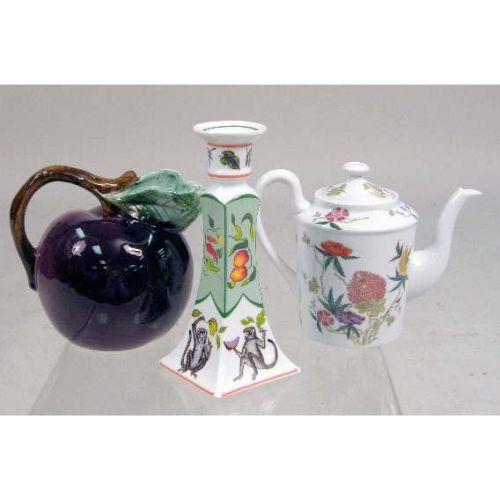 THREE POLYCHROME-DECORATED PORCELAIN TABLE ARTICLES<BR><BR>Comprising, a candlestick, signed "Lynn Chase," a teapot signed "Limoges, France," and a plum-form pitcher