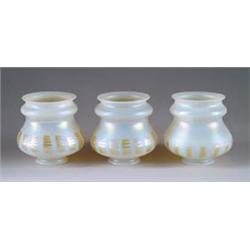 Lot 221 THREE QUEZAL ZIPPER SHADES Beautiful Quezal shades have iridescent clambroth body with gold iridescent zipper design. Two of the shades have similar zipper design and the third is somewhat different. Signed on inside of fitter “Quezal”. SIZE: 4-1/2” t x 4-1/2” dia. CONDITION: Very good to excellent. 5-71531