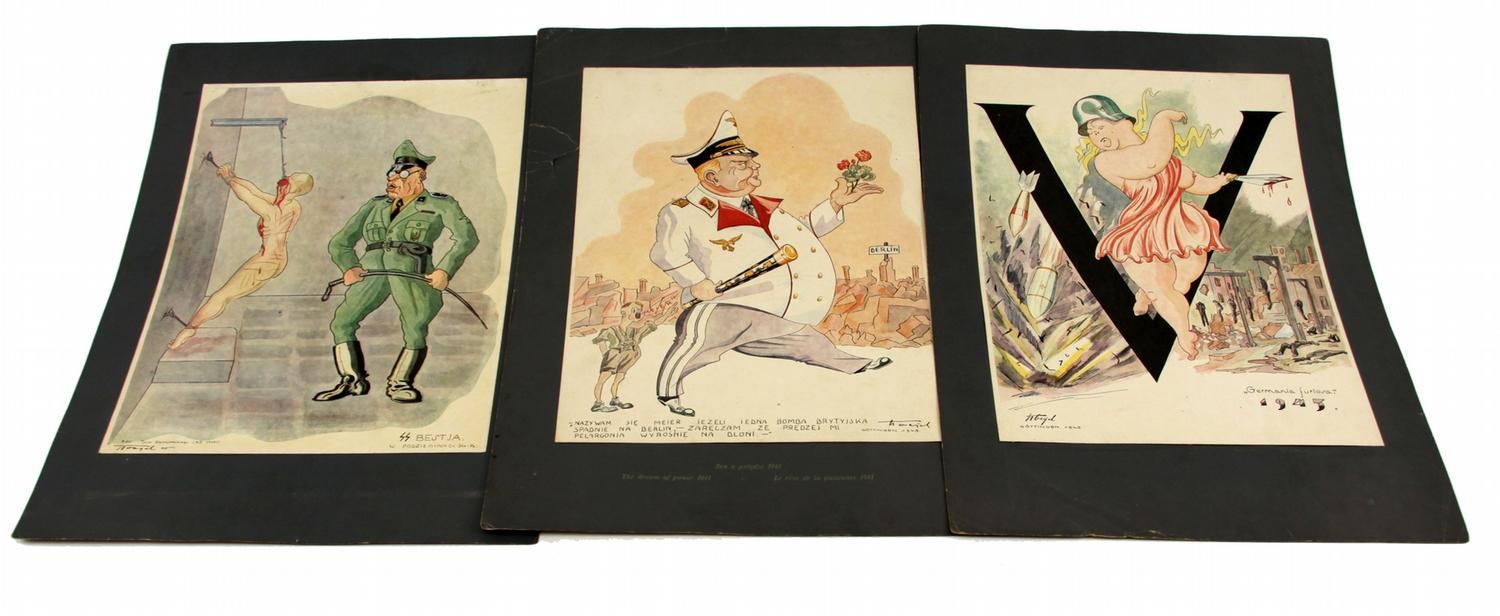 Included in this grouping are "Germania Furiosa" dated 1945, "The dream of power 1941" and an untitled litho showing SS brutality. All in very good condition with some tears to one mount.