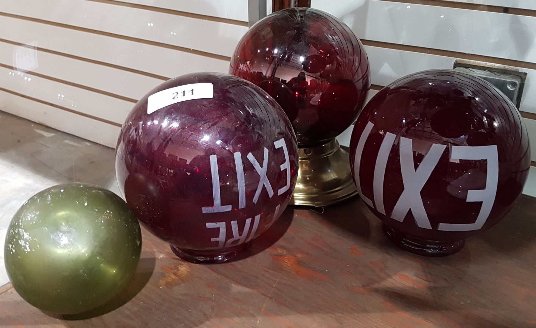 THREE RED GLASS EXIT GLOBES & ONE FISH FLOAT