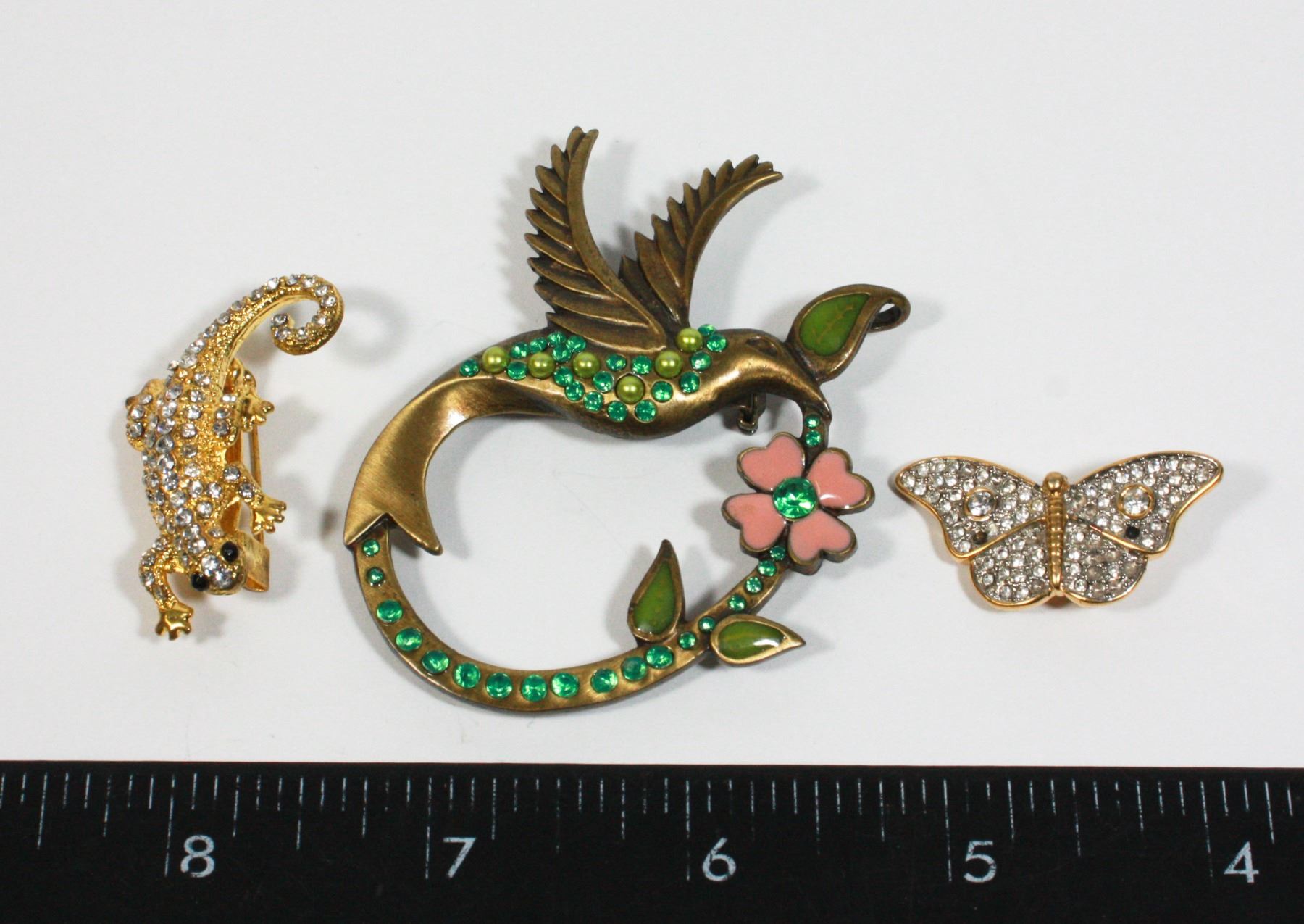 BROOCHES/ PINS. HUMMING BIRD, LIZARD, AND BUTTERFLY (MISSING PART OF BACKER)