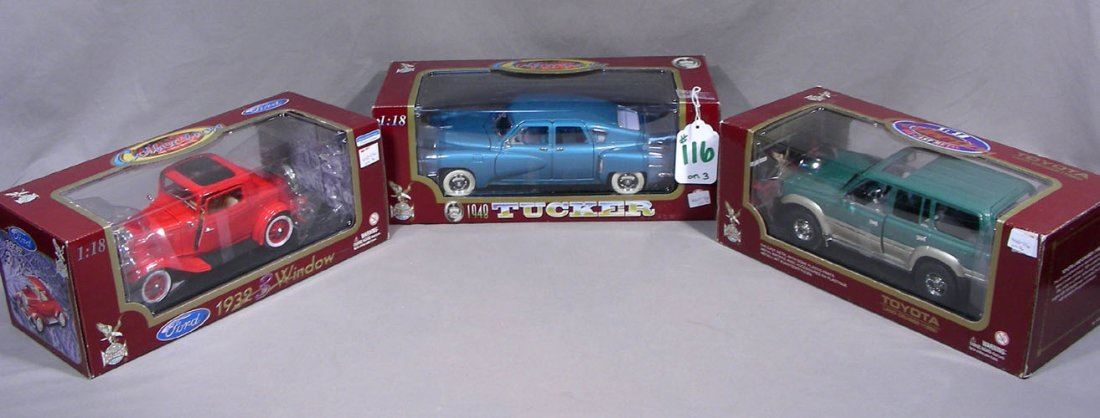 A 1948 Tucker, 1992 Toyota Land Cruiser and a 1932 Ford 3-window. All in original boxes.